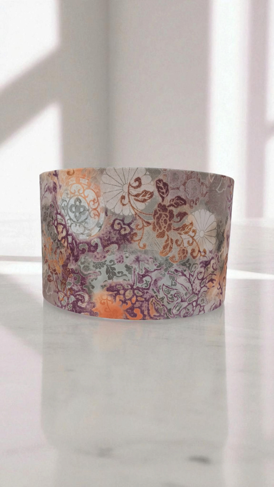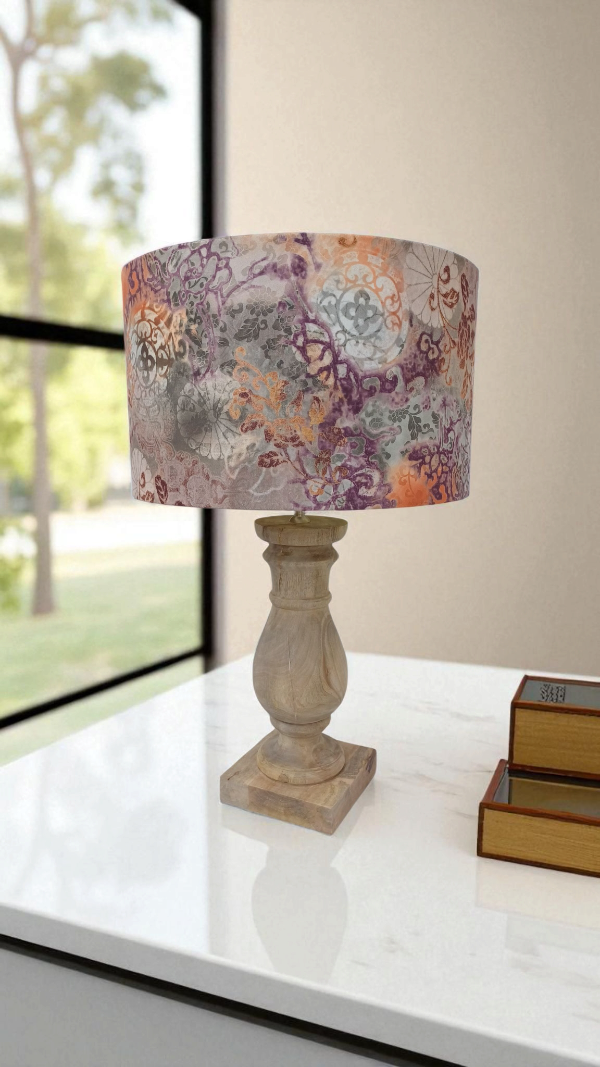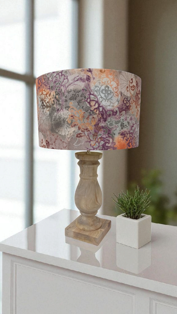 This lampshade is made of high quality velvet fabric with beautiful print and laminated flame retardant gold PVC on the inside.