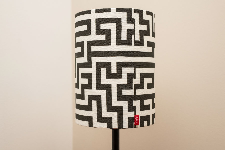 Anna black and white lampshadeThis lampshade is made of high quality linen/cotton fabric with black labyrinth print and laminated flame retardant white PVC on the back side.