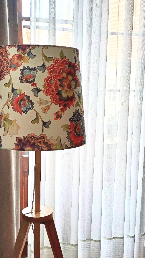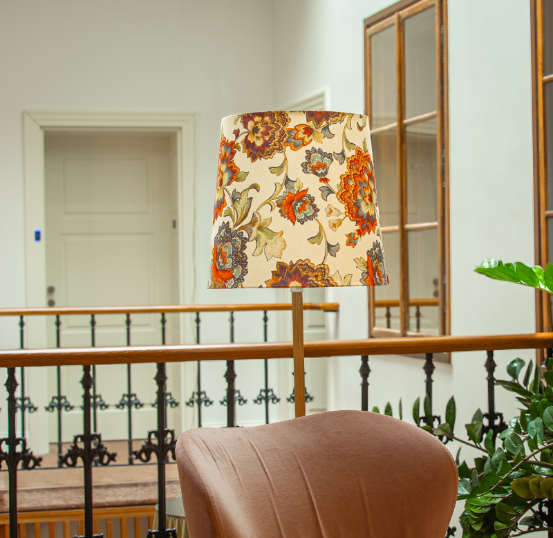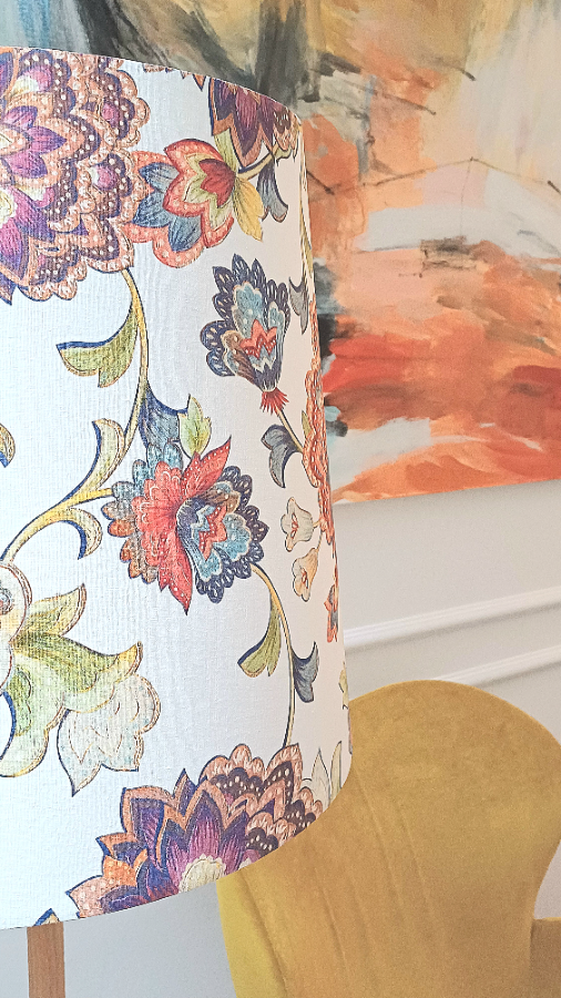 Sofia empire lampshadeThis lampshade is made of high quality linen/cotton fabric with beautiful print and laminated flame retardant white PVC on the back side.