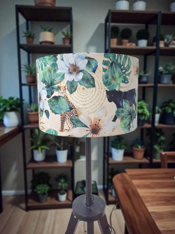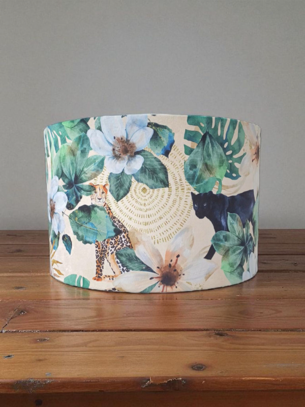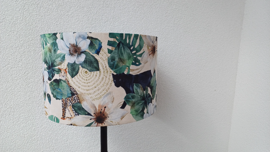This lampshade is made of high quality velvet fabric with leopard/flower print and laminated flame retardant white PVC on the back side.