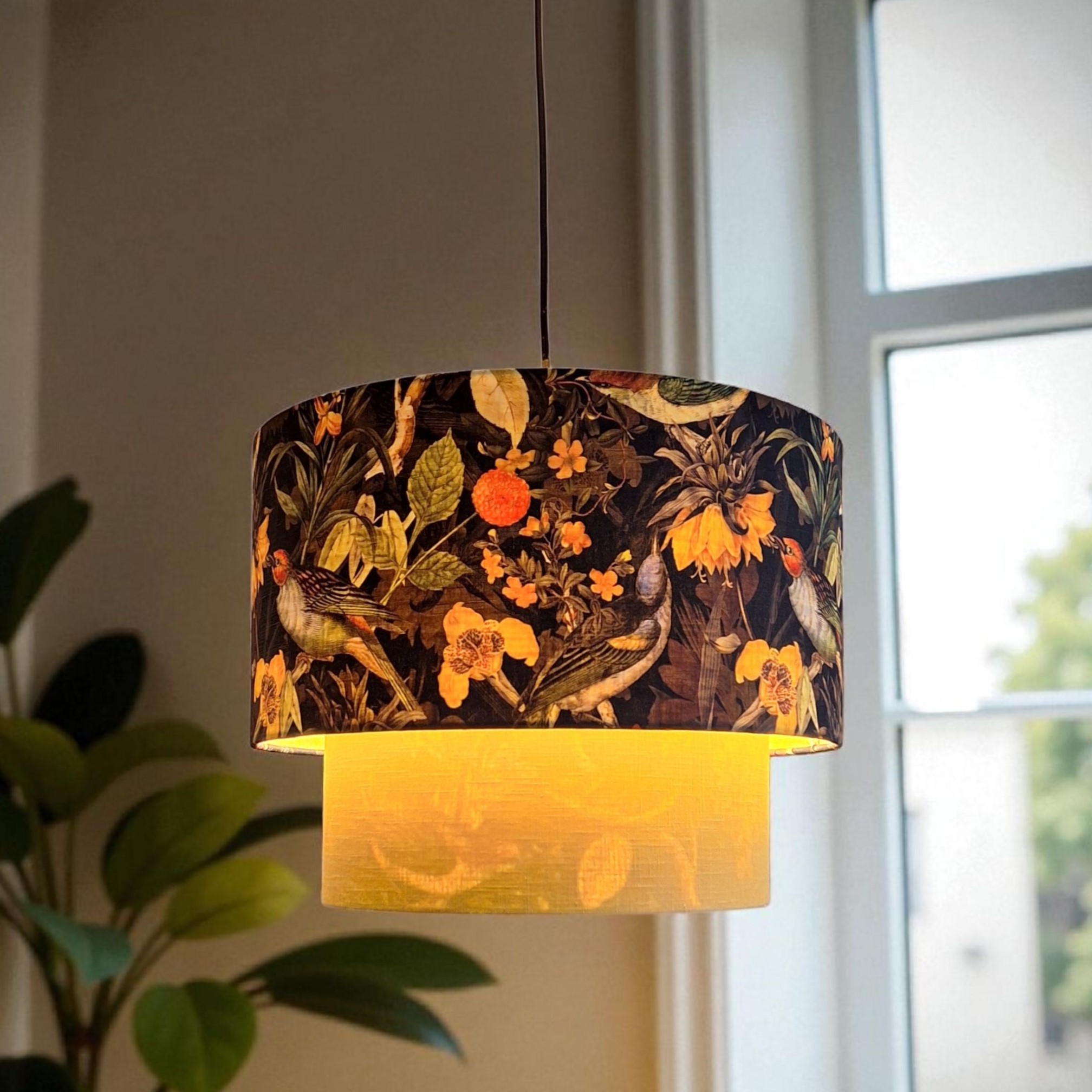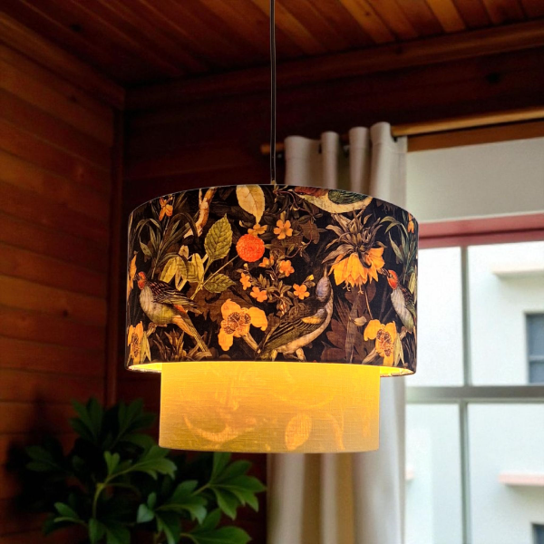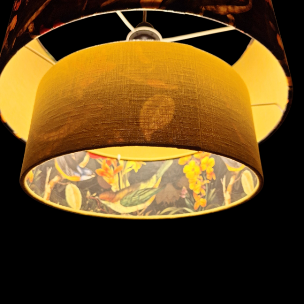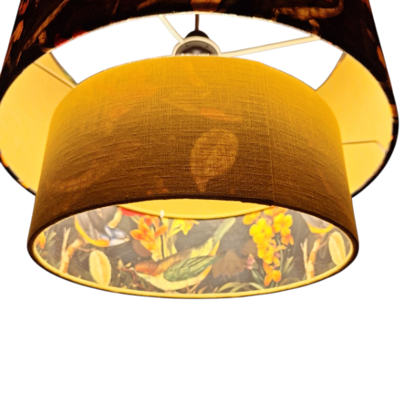 Mariot two tier chandelier – double sidedThe chandelier is crafted from two separate pieces: two lamp shades. Each shade is made with decorative fabric on both sides – on the outside and the inside. We combined a bird-patterned design with a solid ochre linen fabric.